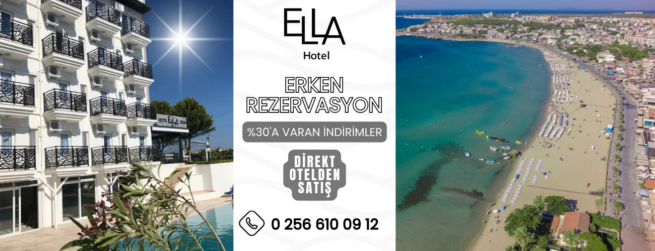 Ella Otel Didim, Altınkum bölgesinde bulunmaktadır. Tesisin denize uzaklığı 60 metre kadardır. 2000 m2 alanda kurulmuş olan Ella Otel Sabah Kahvaltı(08:00-11:00) Cafe Break Saati(15:00-16:00) ,Akşam Yemeği(19:00-20:30) olarak Alkolsüz Herşey Dahil konseptiyle misafirlerimize hizmet vermektedir. Odanızda bulunan split klima ile oda sıcaklığınız ayarlanabilir. Konaklamanız boyunca faydalanabileceğiniz TV, kablosuz internet standart odalarda mevcuttur.Otelimiz Bodrum Milas Havaalanı’na 88 km,İzmir Havaalanına 142 km. Didim Otobüs Terminali’ne 2 km uzaklıktadır.Çocuklara özel su kaydırağımız,araç park yerimiz ve oyun makinalarımız mevcuttur.Bu özelliklerimizle hem sizler hem de cocuklarınıza huzurlu,keyifli.eğlenceli dolu dolu bir tatil fırsatı sunmaktayız.